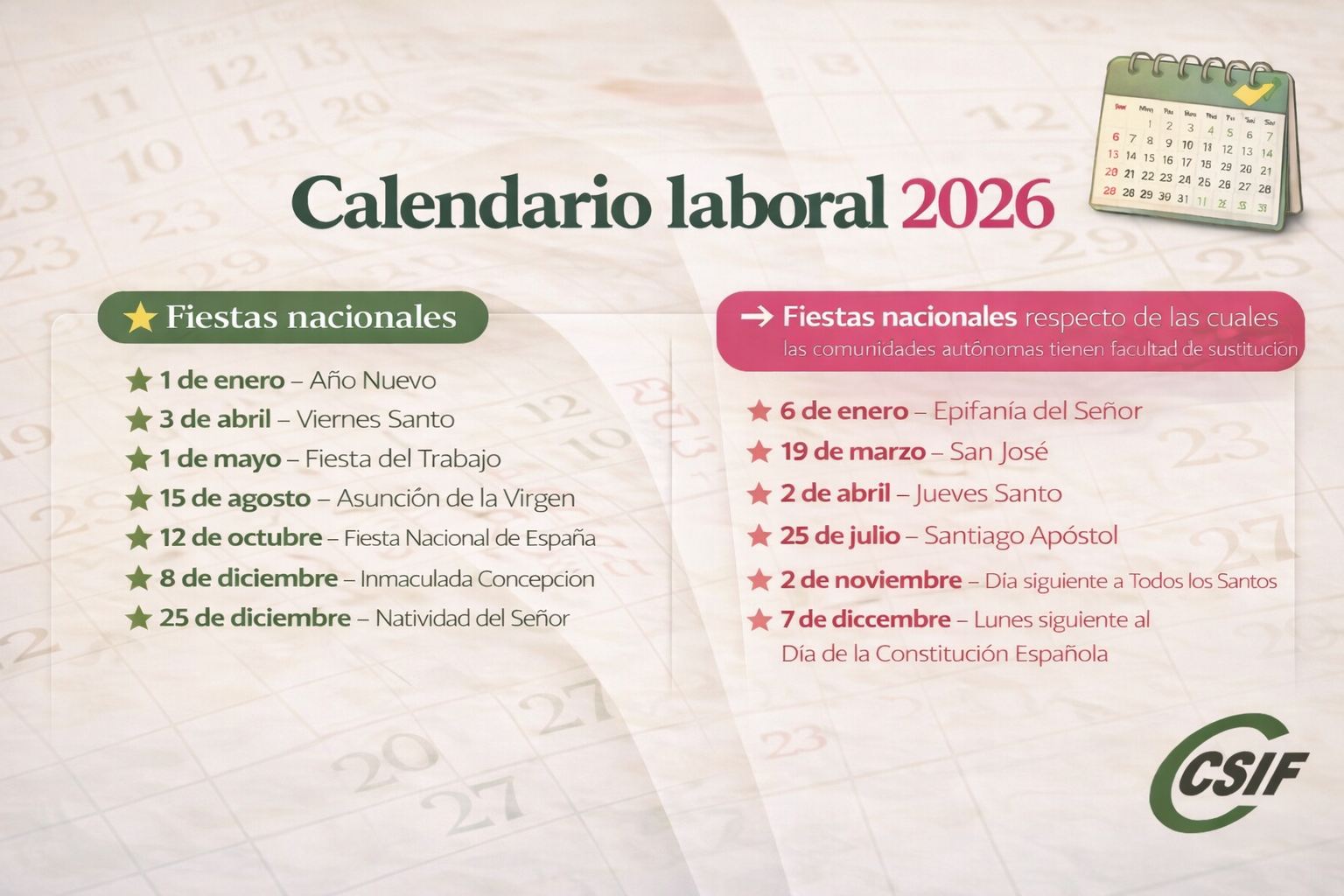 CSIF JUSTICIA INFORMA: Os recordamos el calendario laboral para este 2026.